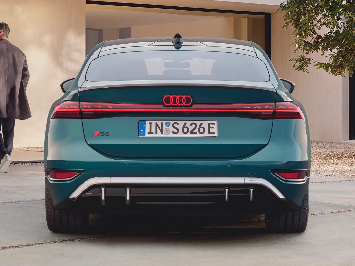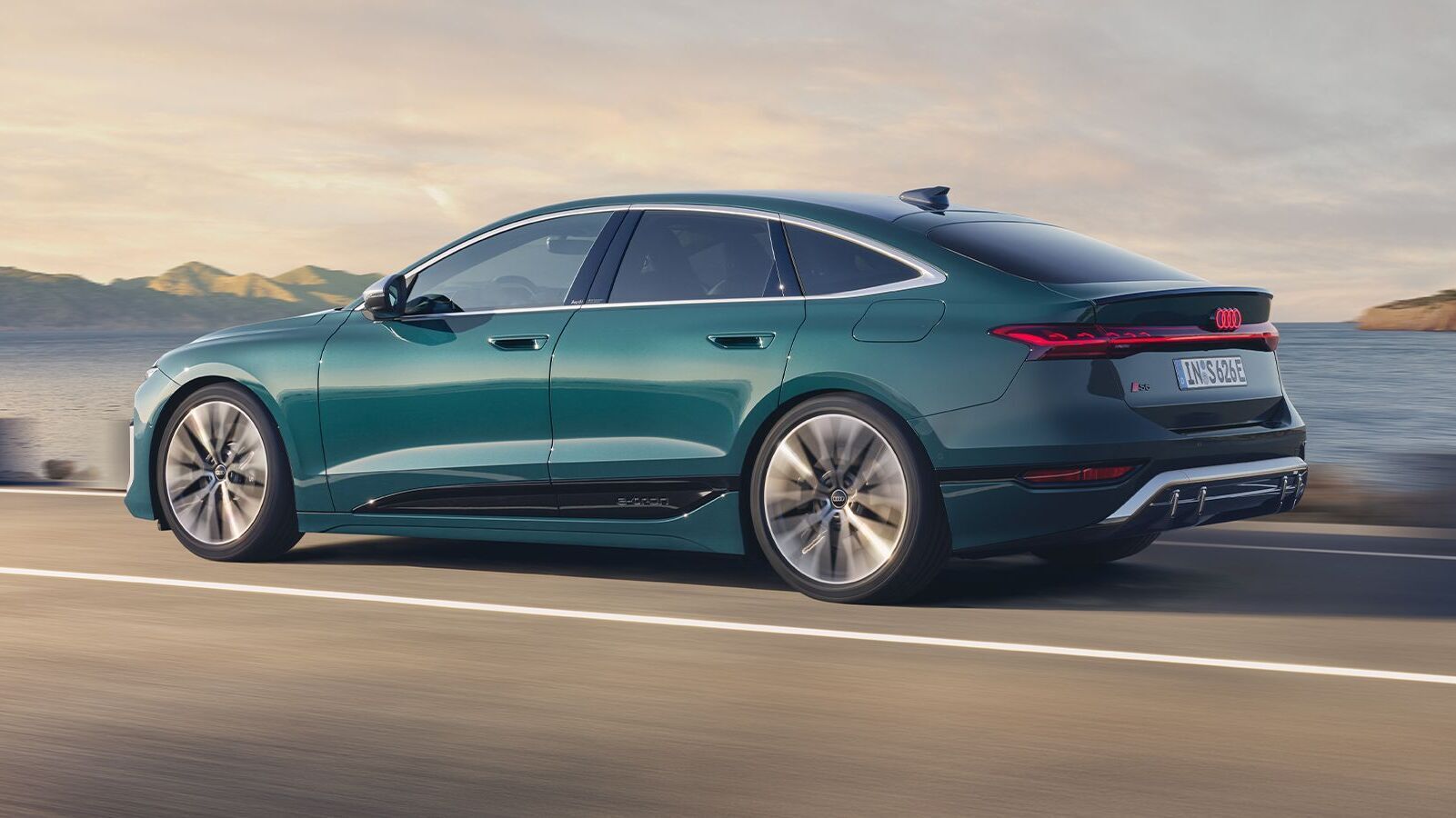 Die progressive Ästhetik des Fahrzeugs wird durch die geschwungene Coupé-Dachlinie und die flache Kabine betont, die in Kombination mit den S-spezifischen Anbauteilen eine klare Ausrichtung auf Sportlichkeit zeigt. Die weiterentwickelte e-tron Designsprache bringt den dynamischen Charakter des Fahrzeugs besonders zur Geltung.