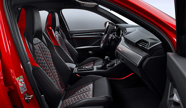 Im Innenraum von RS Q3 und RS Q3 Sportback setzt sich das sportliche Design des Exterieurs fort. Das Interieur wirkt weit und luftig und dynamisch. Angefangen mit dem serienmäßigen, unten abgeflachten RS-Sportlederlenkrad mit Multifunktionstasten, den serienmäßigen Dekoreinlagen in Aluminium Race anthrazit – optional in Klavierlack schwarz oder Carbon – bis hin zu den optionalen RS-Sportsitzen in Feinnappa-Leder mit RS-spezifischer Wabensteppung und integrierten Kopfstützen.
