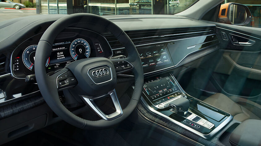Steigen Sie ein und fühlen Sie sich wohl. Dank seiner Breite von zwei Metern bietet der Audi Q8 für ein SUV-Coupé ein großzügiges Raumgefühl. Das reduzierte, edle Design, die auf Wunsch verfügbaren Individualkontursitze mit Massagefunktion und Belüftung, die optionale Vierzonen-Klimaautomatik und das optionale Air Quality Paket unterstreichen das noble Ambiente zusätzlich. Der Audi Q8 ist serienmäßig mit dem Top-Infotainmentsystem MMI Navigation plus ausgestattet. Es integriert das Audi connect-Datenübertragungsmodul mit dem Standard LTE Advanced sowie einen WLAN-Hotspot. Die Online-Services von Audi connect ergänzen die Routenplanung vorausschauend. Eine innovative Sprachsteuerung ermöglicht es, zahlreiche Funktionen vom Lenkrad aus sicher und prompt abzurufen. So wird der Audi Q8 zum intelligenten Dialogpartner.